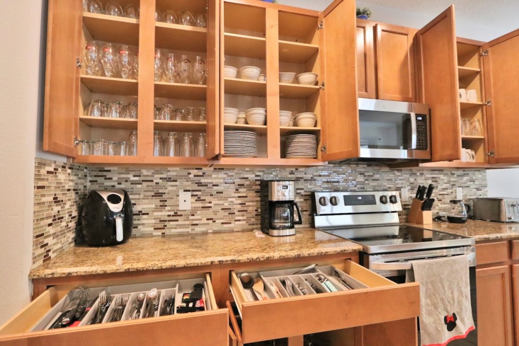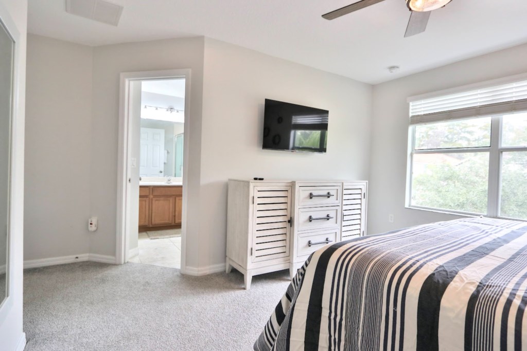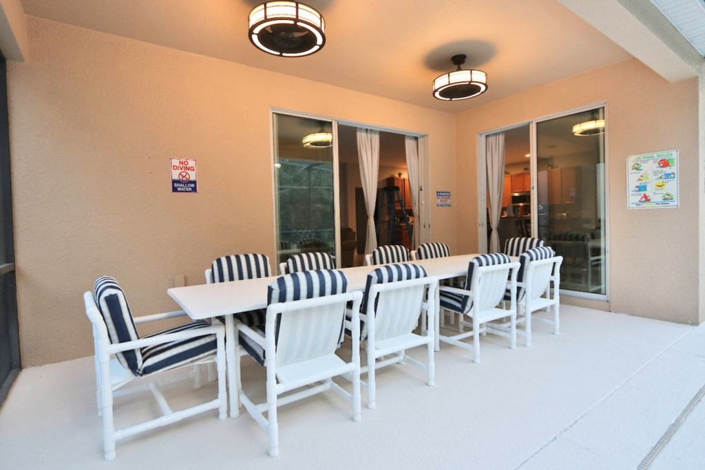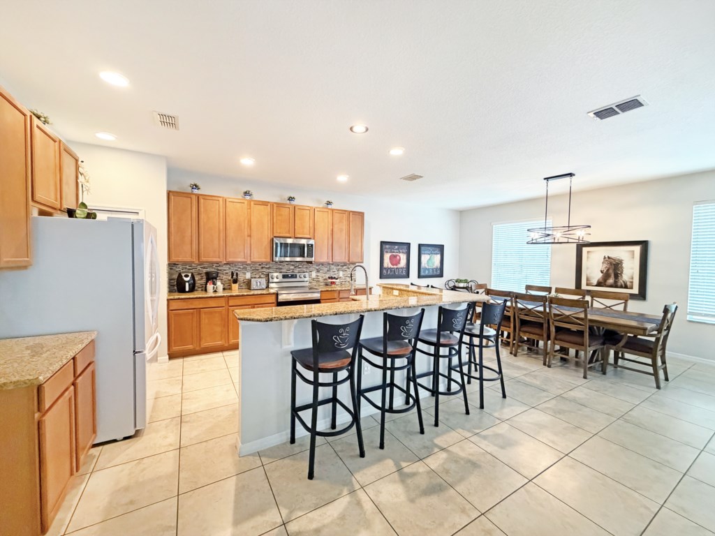 The home has two living areas offering plenty of space to spread out and relax. The bright front living area as you enter has comfortable sofas, plus a breakfast area table and chairs. Settle in the rear living room with large TV and watch a movie together. The space also has large patio doors leading to the pool deck.