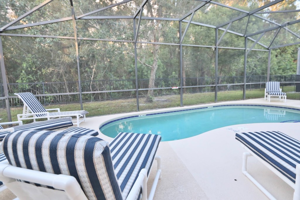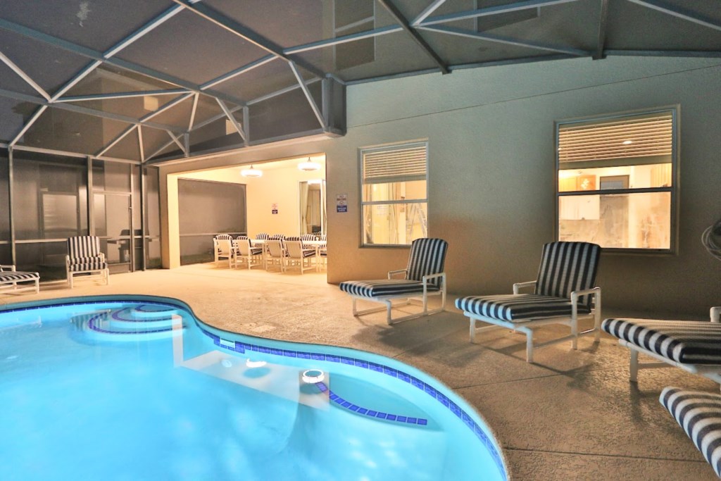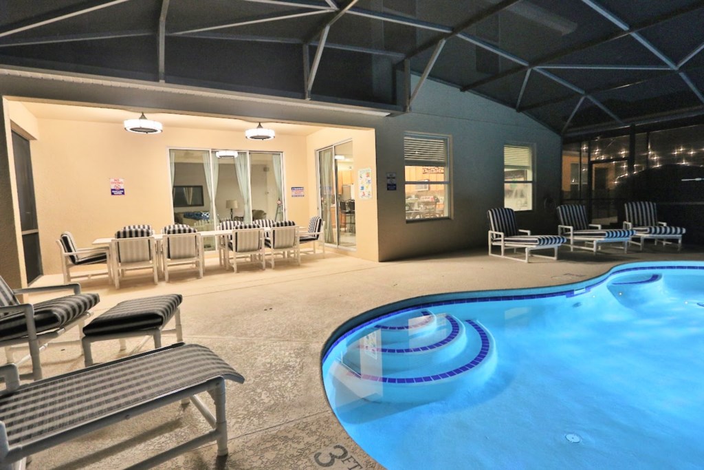 Outdoors the pool area faces west and enjoys the Florida sunshine throughout the afternoon until the end of the day. Enjoy a meal under the covered shady area, splash around in the crystal clear pool, or soak up the sun on the loungers. A BBQ is provided for guest use – a charge applies if you would like this prepared for you (full tank of propane + clean before/after stay). Pool heating available at an additional cost.